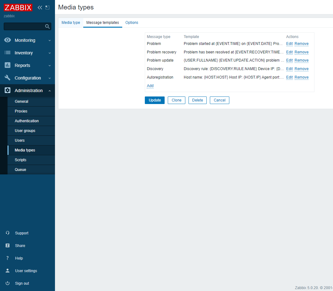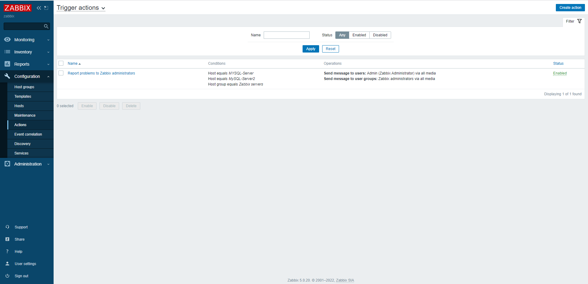 Configuration -> Actions -> Report problems to Zabbix administrators -> Operations 의 연락 방법을 all로 지정