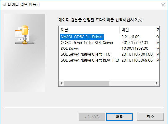 시작 -> ODBC 데이터 원본 관리자 -> 시스템 DSN -> 추가
