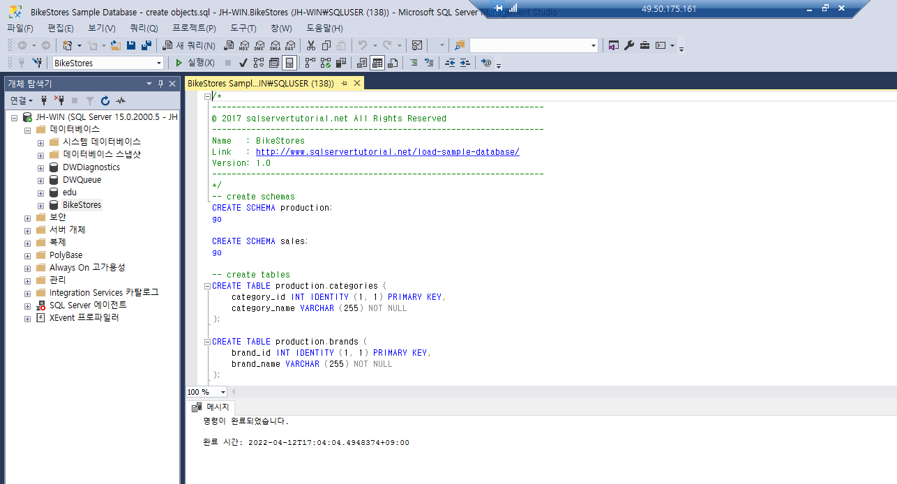 BikeStores Sample Database - create objects.sql – 이 파일은 스키마 및 테이블을 포함하는 데이터베이스 객체를 생성하기 위한 것입니다.
