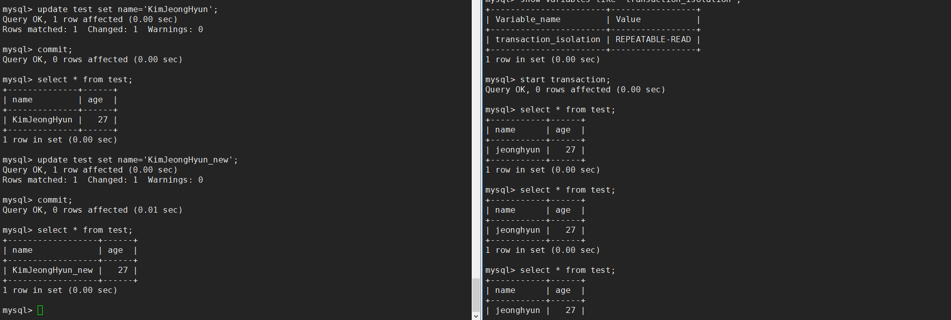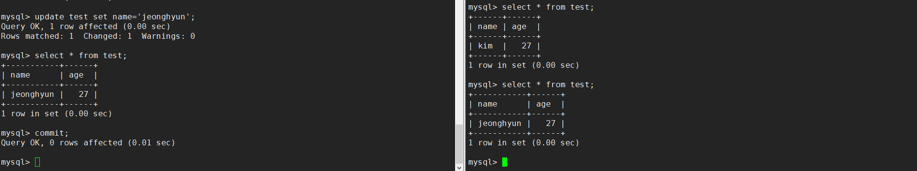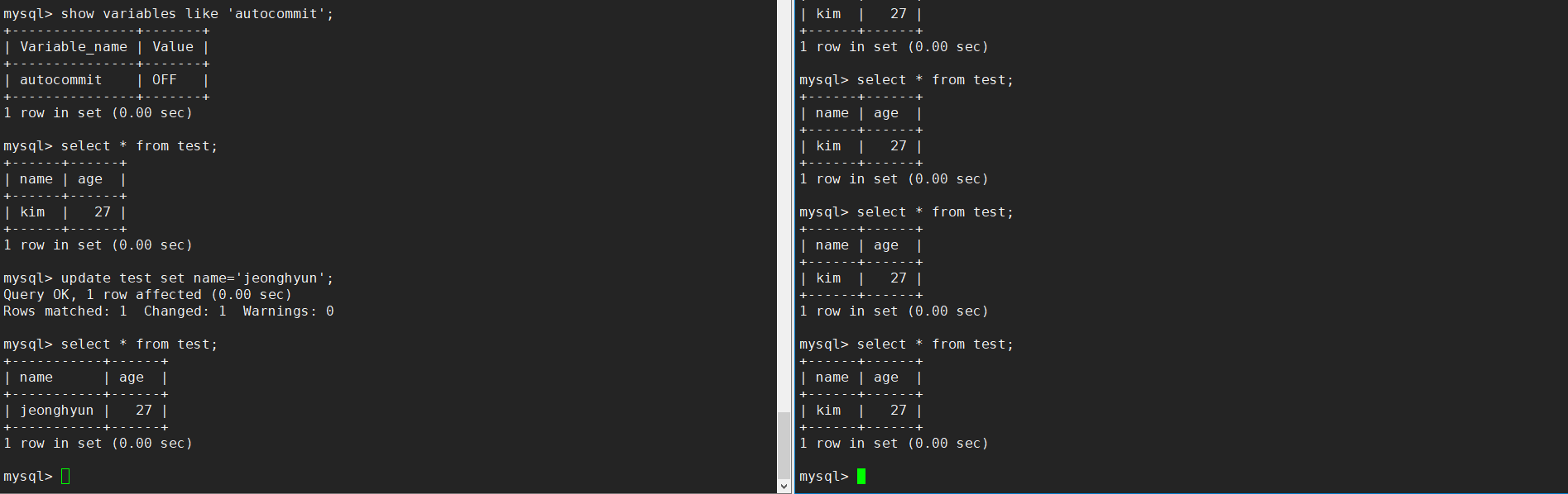 ■ 좌측 세션에서 변경 사항을 commit해도 다른 세션(우측 세션)에서는 해당 사항이 반영되지 않습니다.
