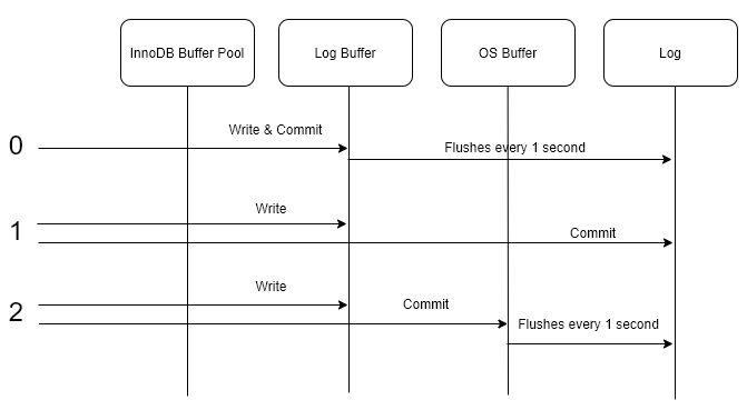 * 데이터의 유실에 민감한 서비스라면 Default 값인 1로 설정해두고 서버가 내려갔을때 1초 정도의 Data 유실은 민감하게 받아들이지 않는 서비스라면 0, 2로 값을 변경하여 성능을 높이는 것이 좋다.