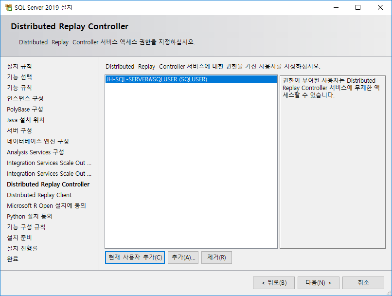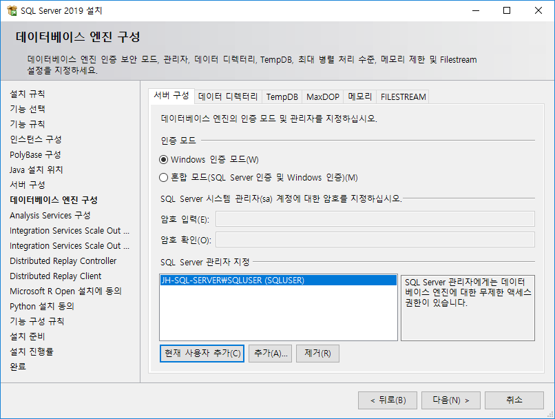■ Windows 인증 모드 선택 후 현재 사용자 추가