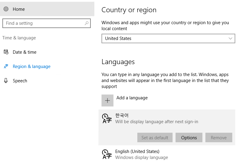 설정 -> Region & lanuage에서 한국어 options에서 download 후 set as default로 기본 설정
