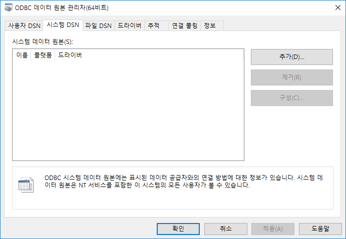 시작 -> ODBC 데이터 원본 관리자 -> 시스템 DSN -> 추가